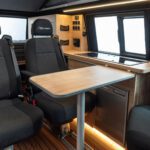 Sitze in der ersten Reihe in Fahrtrichtung. Sitze der zweiten Reihe (nebeneinander) mit Blick auf den Wohnraum. Sitze der dritten Reihe in Fahrtrichtung. Tisch ausgeklappt. Unteres Bett eingeklappt.